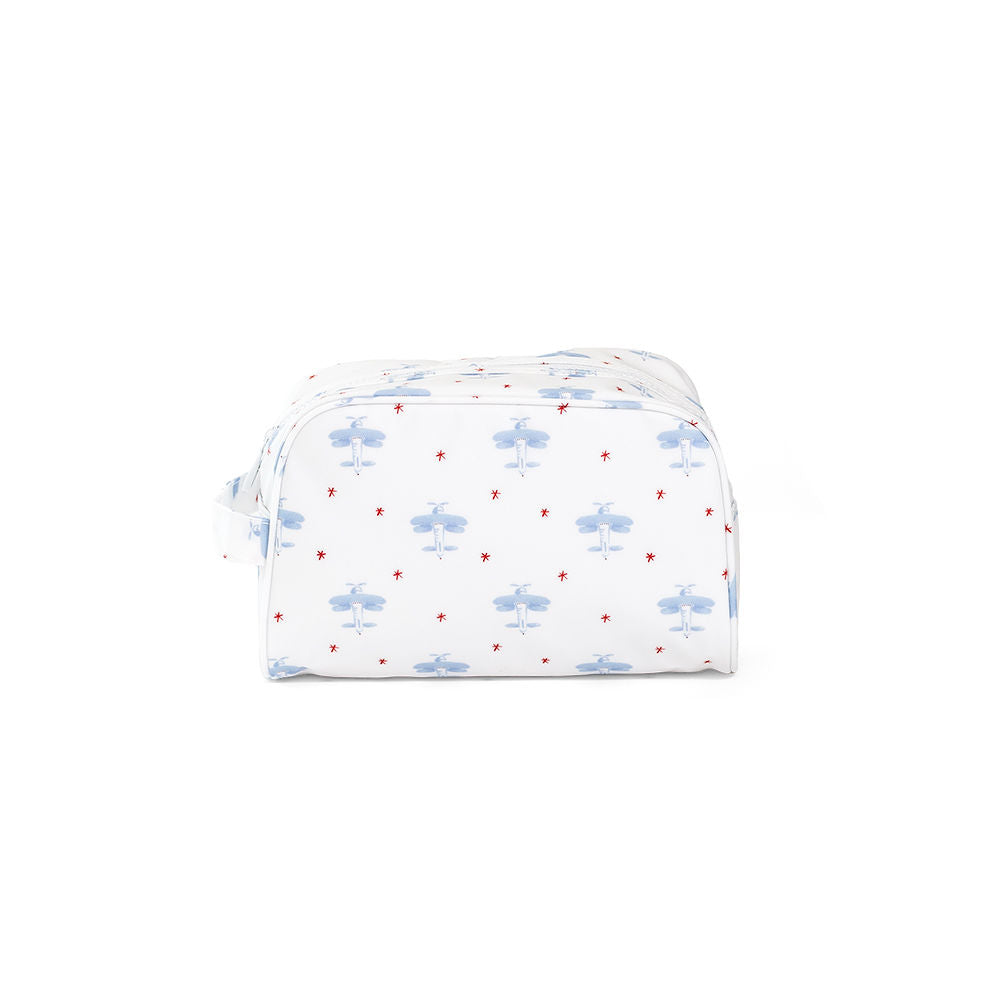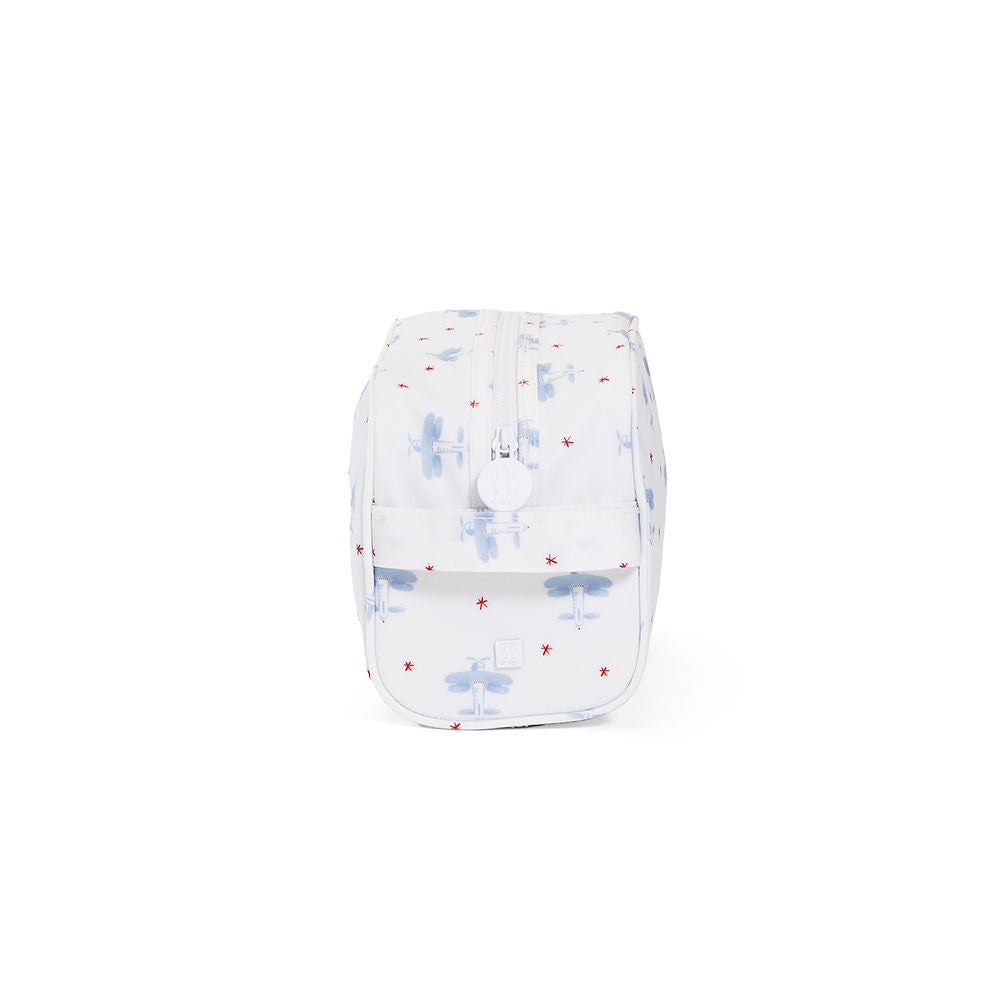 This soft yet sturdy toiletry bag is the perfectStowawayat home or on the go! It's roomy size can store your grooming supplies, make-up, hair care, plus holds a supply of diapers and wipes. Styled with a chunky top zip, wide gusset and side handle plus a roomy interior and wall pocket - the exterior is coated and interior is wipeable and this bag is machine washable!