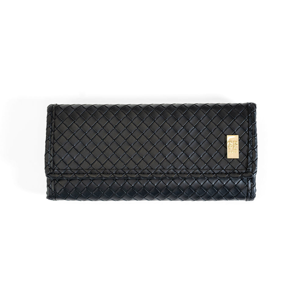 Our Luxe Woven Jewelry Wallet in Jet is a chic refresh of a TRVL favorite, designed to keep your jewelry secure and organized wherever you go. With smart interior details and a coordinating pinstripe lining, it’s a polished essential that pairs beautifully with the entire TRVL collection.