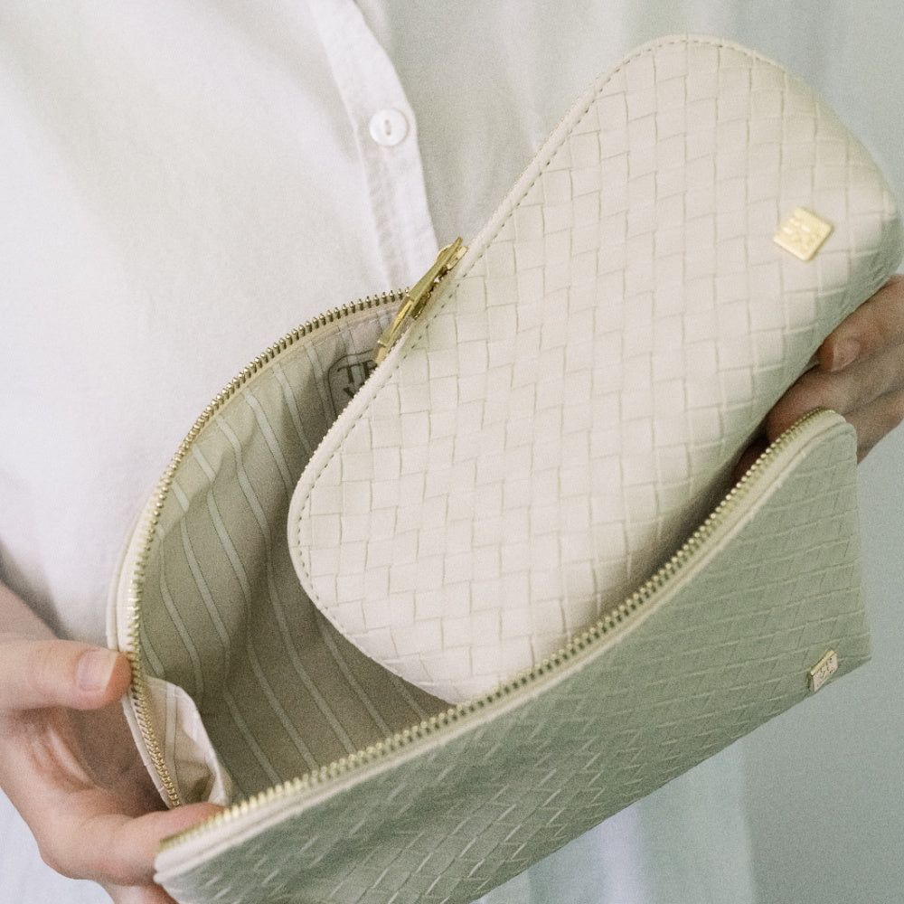 Our new Duo Case in Sand is crafted in our vegan woven saffiano and offered in our signature luxe colors—now with a brighter twist—this two-in-one set. Designed to carry it all: makeup, brushes, travel toiletries, and everyday essentials. Each pouch features a double zip closure that opens wide for easy access, while the slim design slips seamlessly into your daily bag for effortless beauty on the go.
