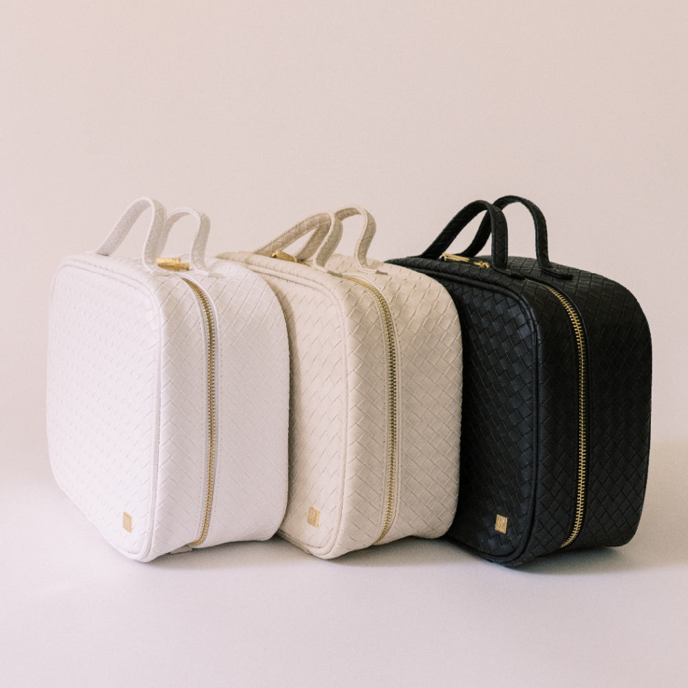 The Luxe Woven TRVL2 Cosmetic Case in Blanc is a polished update to a classic—crafted in our textured vegan woven with a wipeable finish and lined in our coordinating pinstripe interior. Spacious and organized with 3 removable pouches, a zip pocket, and chic gold hardware, it’s the ultimate travel-ready essential.