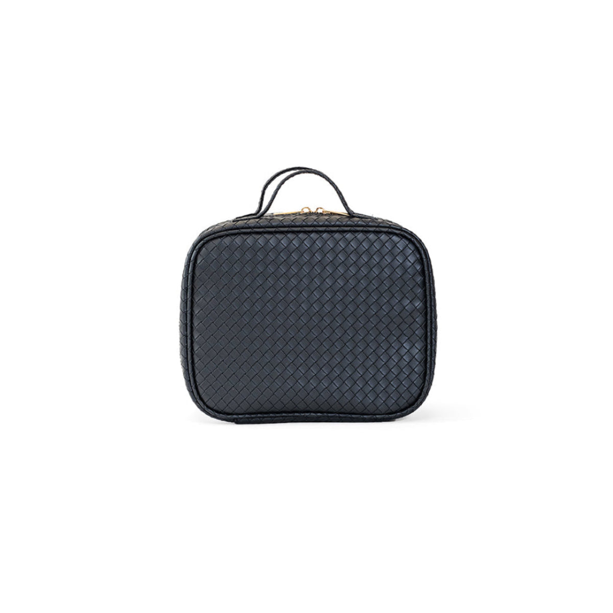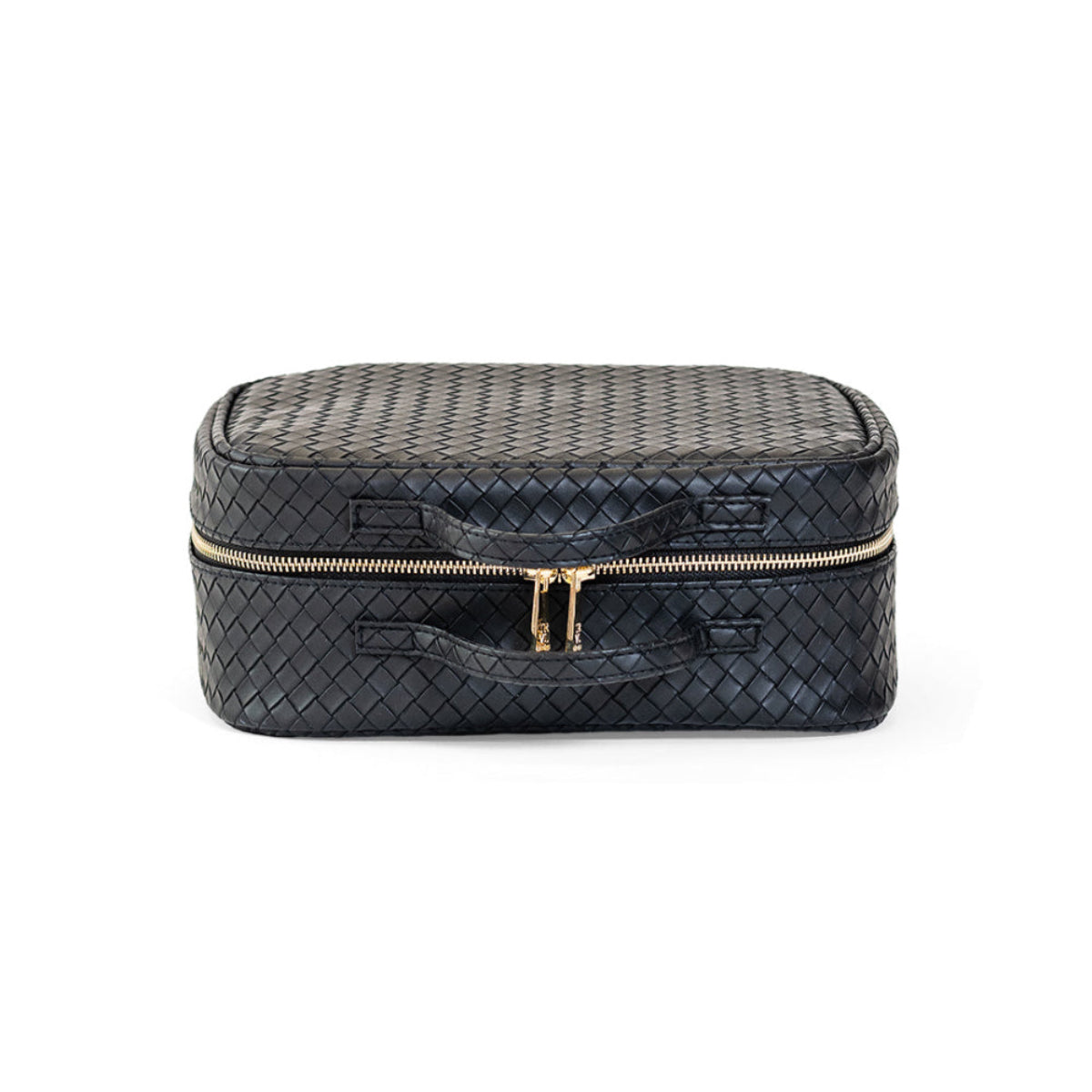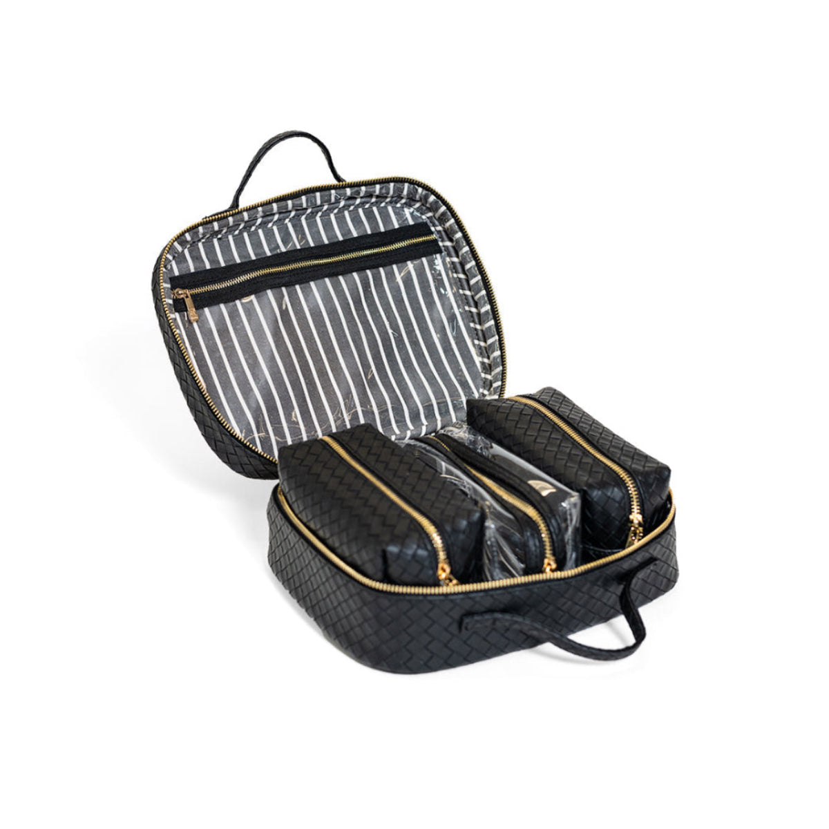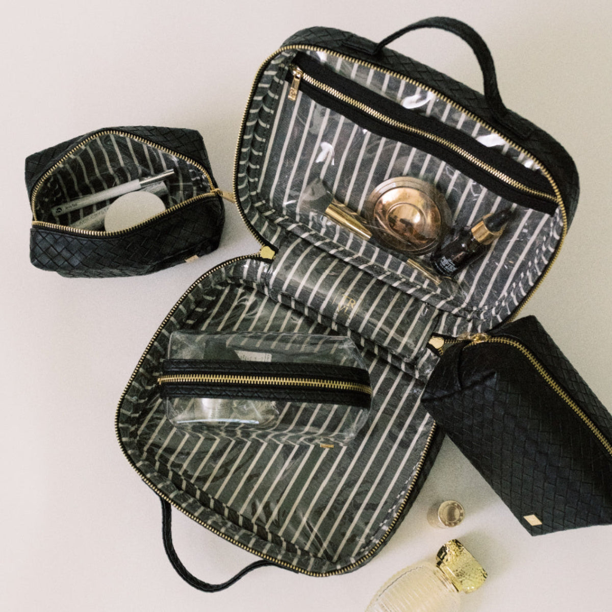 The Luxe Woven TRVL2 Cosmetic Case in Jet is a polished update to a classic—crafted in our textured vegan woven with a wipeable finish and lined in our coordinating pinstripe interior. Spacious and organized with 3 removable pouches, a zip pocket, and chic gold hardware, it’s the ultimate travel-ready essential.