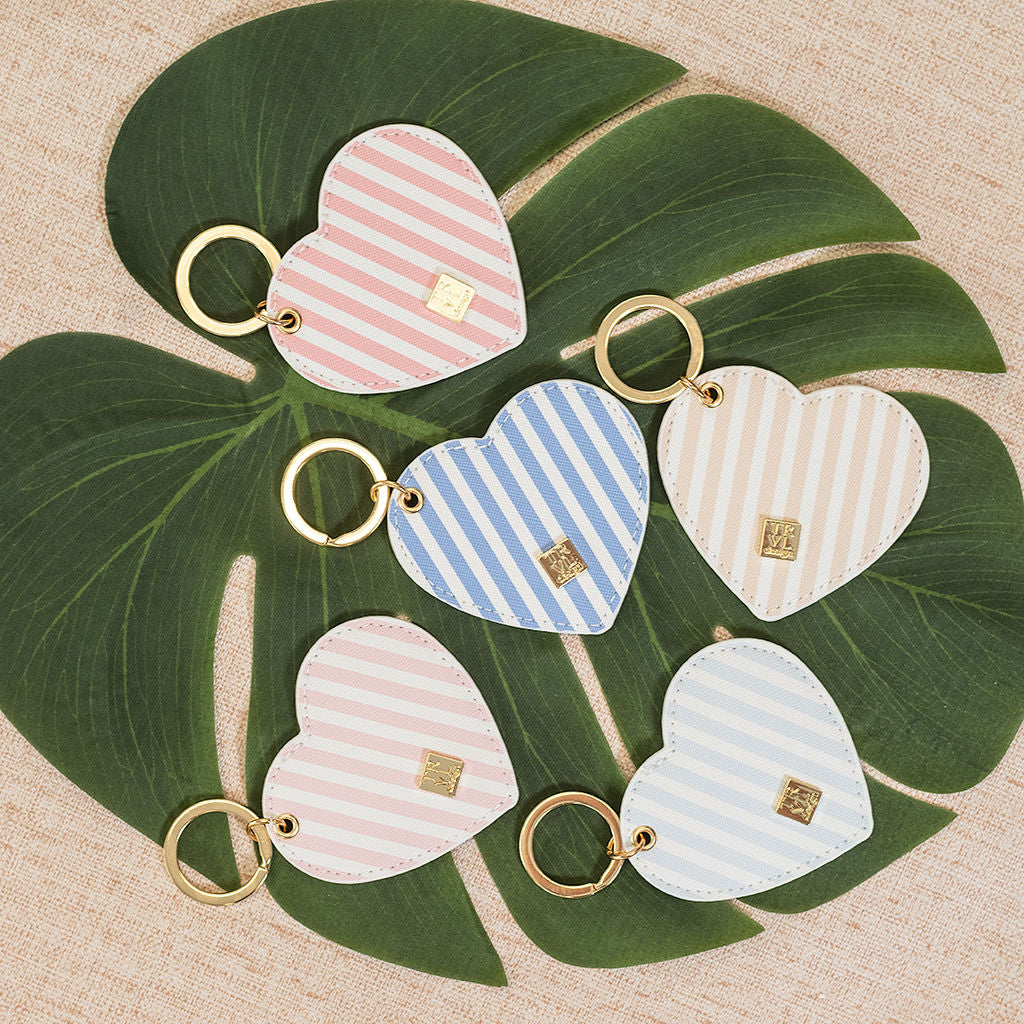 Wear your heart on your keys with our Pimlico Stripe Keychains. The set comes with 1 of each color in Blue, Pink, Chambray, Sand and Dusty Rose.