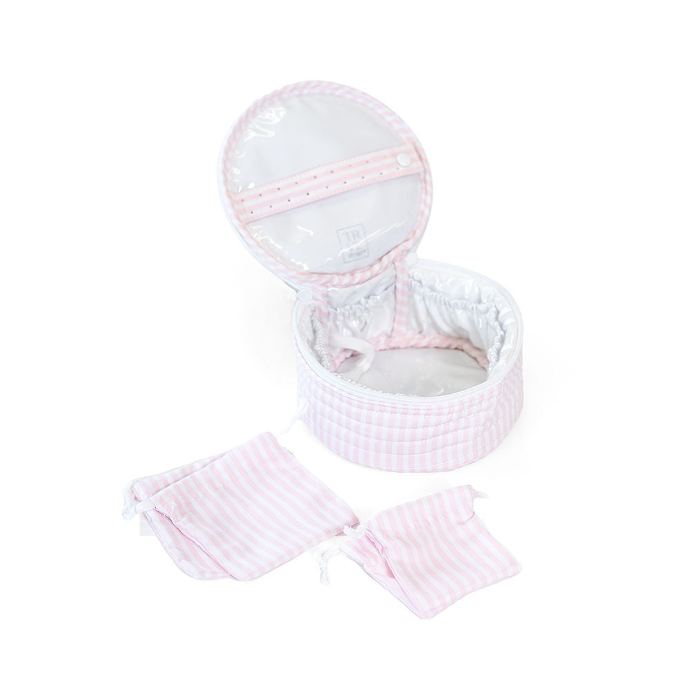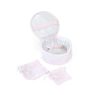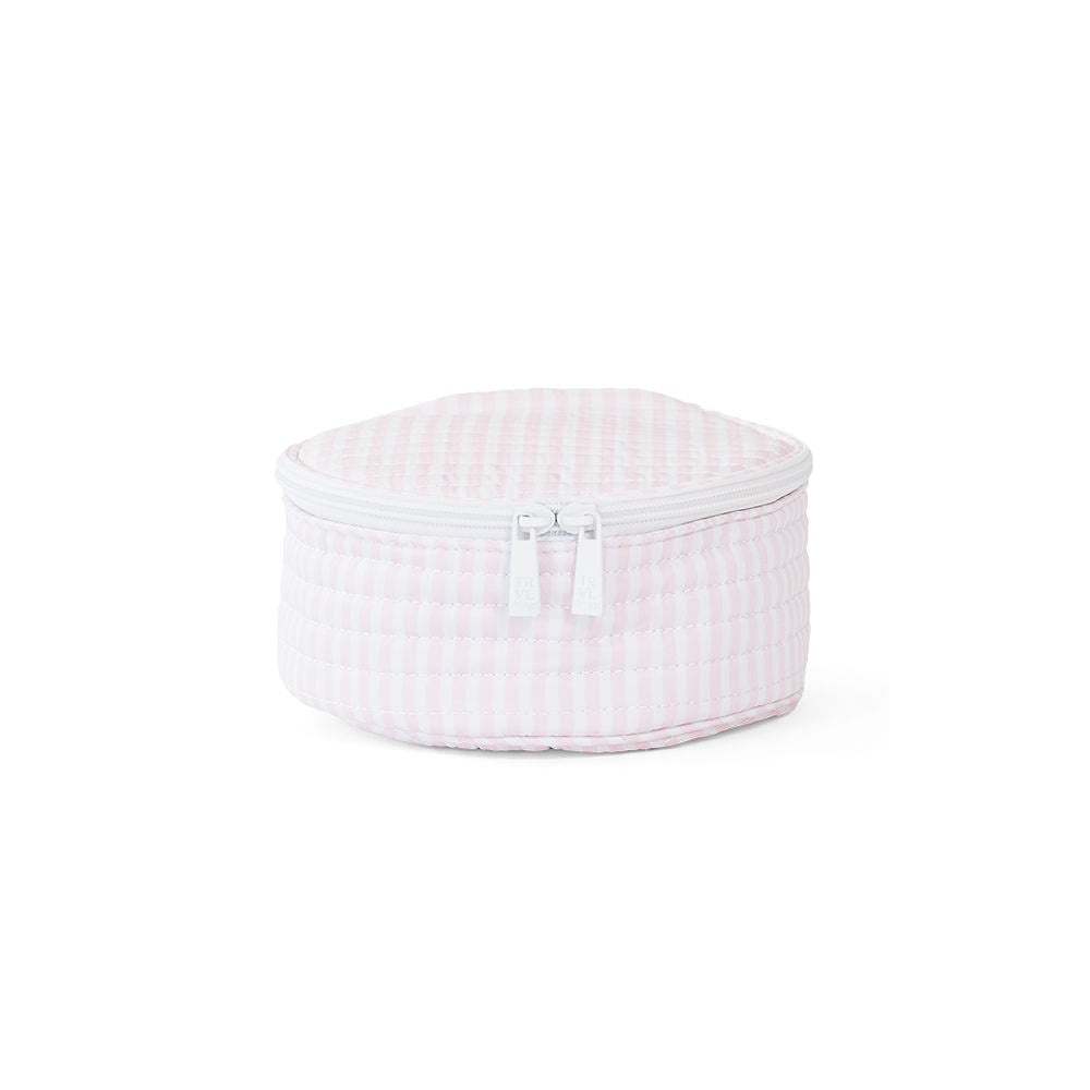 Our Quilted Jewel Round is super lightweight and a perfect place to store your bits and baubles. It opens up to offer ample room for earrings, necklaces, rings, and bracelets with elasticized compartments around the outer edge. This also comes with a snappable earing bar and 4 drawstring pouches that can be gathered together on a keeper. This case makes the perfect thoughtful gift for a lover of jewelry and accessories, or an ideal treat for yourself when you're off on your travels.