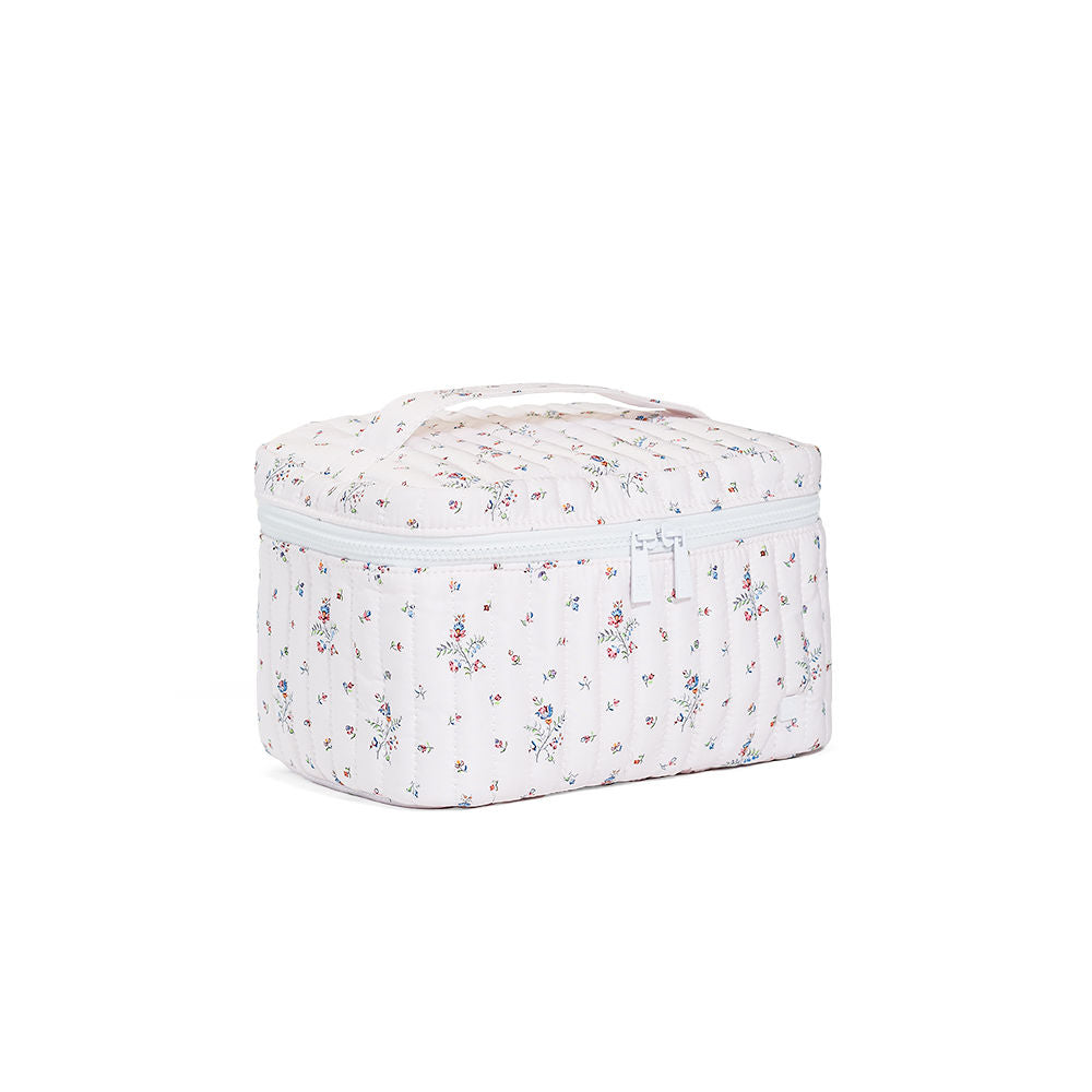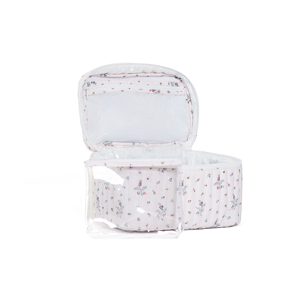 Our Quilted Train Set is super stylish and  lightweight  that will keep your cosmetics organized on the go. It opens up to offer ample room for makeup and beauty products, a zippered mesh pocket on the inside lid, elasticized compartments around the outer edge, and a removeable clear pouch. This set makes the perfect thoughtful gift for a lover of beauty and cosmetics or it can be an ideal treat for yourself when you're off on your travels.