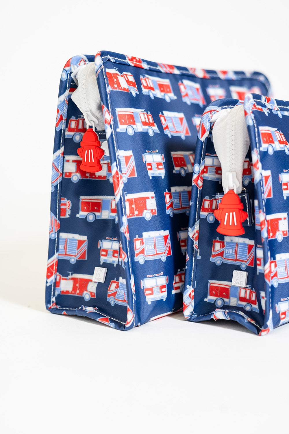 Our best-selling Roadies are our BFFs in the pouch world! Available in 3 sizes, our Large Roadie is made in a cotton gingham with a thin Eco-friendly matte coating, an inside slip pocket and exterior snap open zip tabs for a wider opening and an easier access.