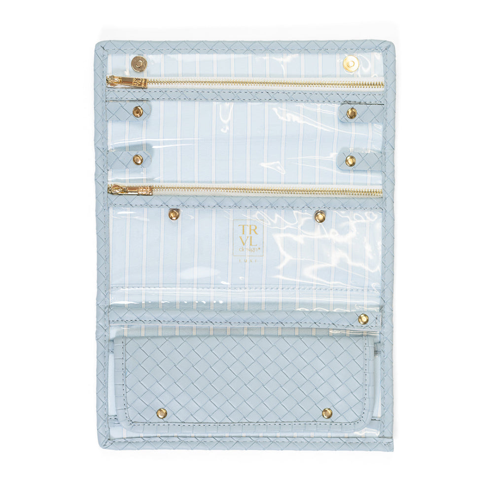 Our Luxe Woven Jewelry Wallet in Surf is a chic refresh of a TRVL favorite, designed to keep your jewelry secure and organized wherever you go. With smart interior details and a coordinating pinstripe lining, it’s a polished essential that pairs beautifully with the entire TRVL collection.